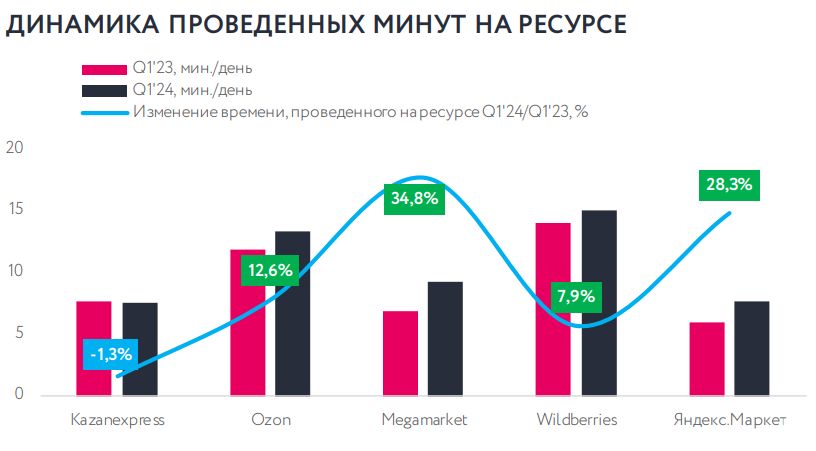 В первую пятерку крупнейших маркетплейсов в E-Promo включили Wildberries, Ozon, «Мегамаркет», Kazanexpress и «Яндекс. Маркет». Лидерами по динамике роста времени, проведенного на ресурсе в первом квартале 2024 года, стали «Мегамаркет» и «Яндекс.Маркет» — рост на 34,8% и 28,3% соответственно. Единственным маркетплейсом, продемонстрировавшим падение по временным показателям медиапотребления, стал Kazanexpress (-1,3%).