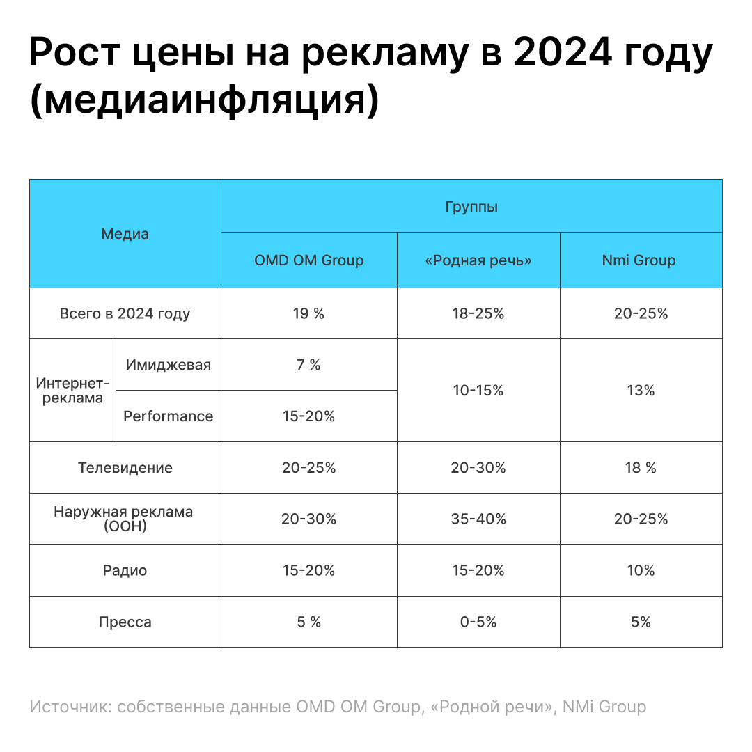 В рекламных группах разошлись в оценках того, какие будет рост цен в сегменте e-com по итогам всего 2024 года. В «Родной речи» посчитали, что размещение в ритейл-медиа подорожает на 35-40%, при этом цены на интернет-рекламе без учета этого сегмента поднимутся всего на 10-15%. OMD OM Group прогнозировала, что в 2024-м стоимость рекламы в performance-сегменте в целом на 15-20%. В NMi Group говорили о росте digital-продвижения по итогам этого года на 13%.
