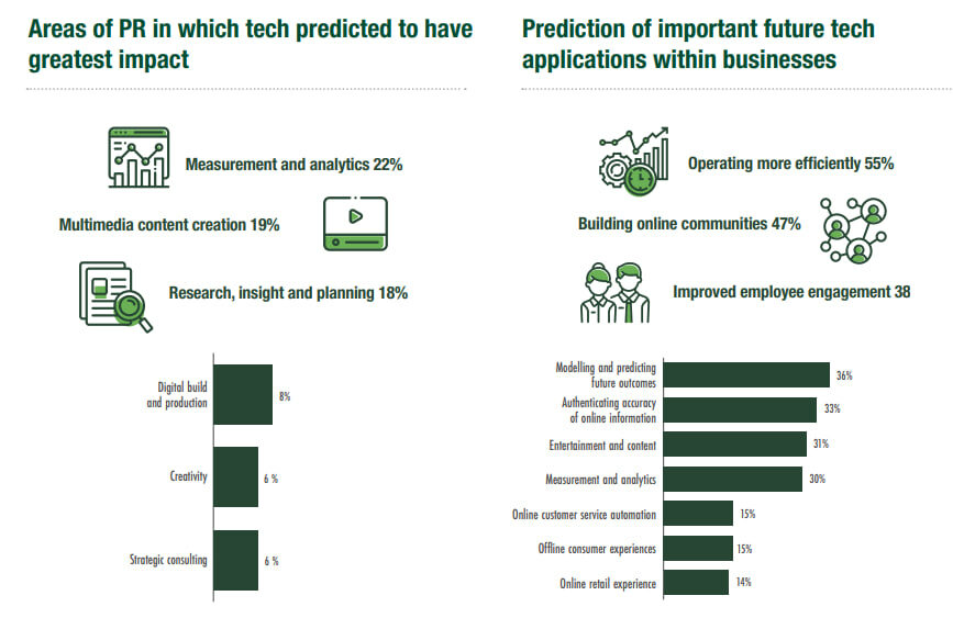 Думаю, уже понятно, что планы на будущее у специалистов по PR и маркетингу грандиозные. В уже упомянутом отчете ICCO говорится, что в ближайшем будущем развитие ИИ-технологий окажет наибольшее влияние на следующие области PR: медиааналитика, создание мультимедиа-контента, анализ данных.