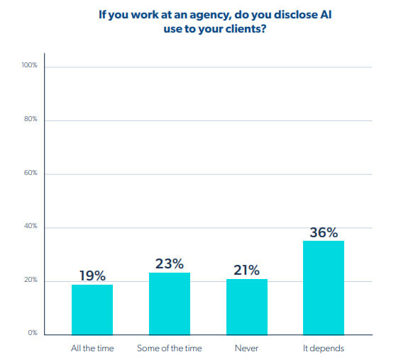 В этом же отчете попался еще один занятный график, — из него следует, что 80% представителей агентств признаются, то либо вообще не ставят клиентов в известность об использовании ИИ в своей работе, либо делают это лишь иногда или от случая к случаю.