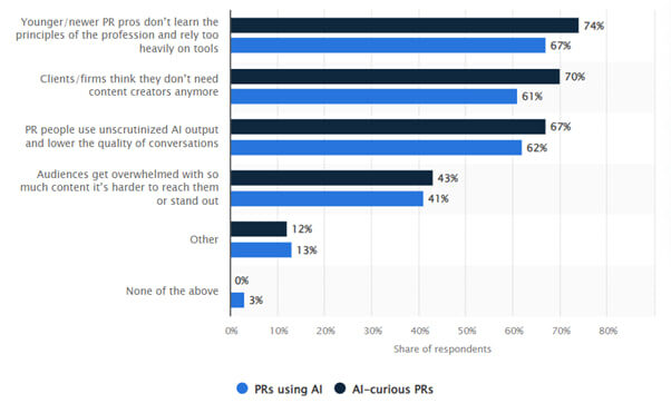 И несколько слов о рисках — без них широкое внедрение ИИ в PR не обойдется. Например, по данным Statista, развитие искусственного интеллекта может обернуться деградацией пиарщиков. Молодые, неопытные специалисты будут слишком сильно полагаться на условный ChatGPT, забудут (или даже не изучат, как следует) основы и принципы профессии и, в конечном итоге, станут не способны проводить PR-кампании, общаться с журналистами и исполнять все остальные обязанности без помощи ИИ-помощников.