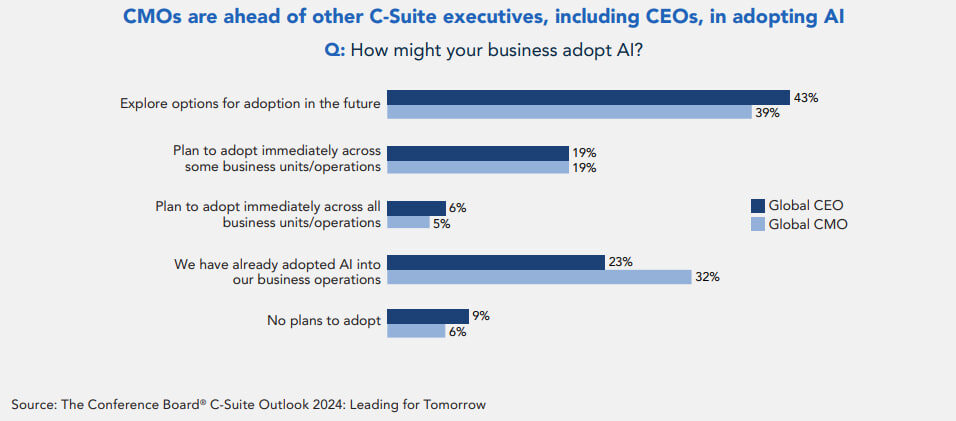 Исследование The Conference Board «C-Suite Outlook 2024 Leading for Tomorrow»: руководители компаний и директора по маркетингу отвечают на вопрос о том, на каком этапе внедрения ИИ сейчас находится их бизнес