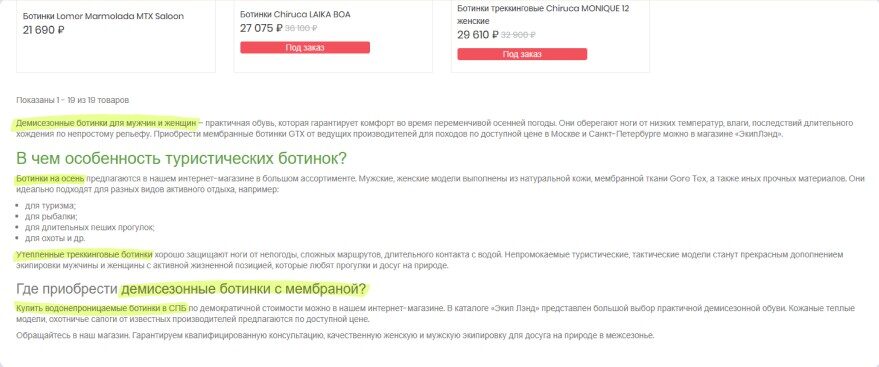 Это не значит, что нужно поместить сюда кашу из ключей — за такое алгоритмы научились банить сайты еще в 2015. Используем возможность для продвижения и одновременно ведём себя уважительно по отношению к посетителю: пишем небольшие незаспамленные тексты про особенности категории продукта, про то, как выбрать товар под разные запросы.