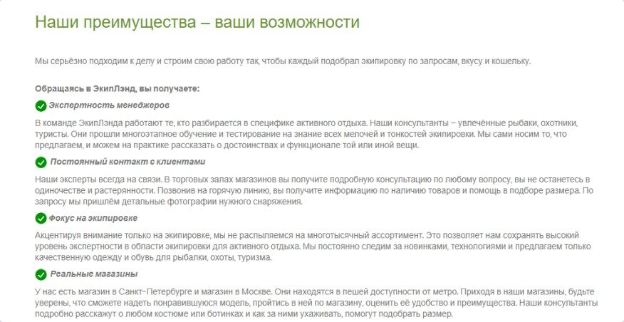 Тут главная задача — не скатиться в банальности («надёжная команда профессионалов») и прямолинейные призывы купить именно у вас. Соберите все преимущества и отличительные характеристики магазина, но разверните их так, чтобы они отвечали на вопрос «какую выгоду это даст покупателю».
