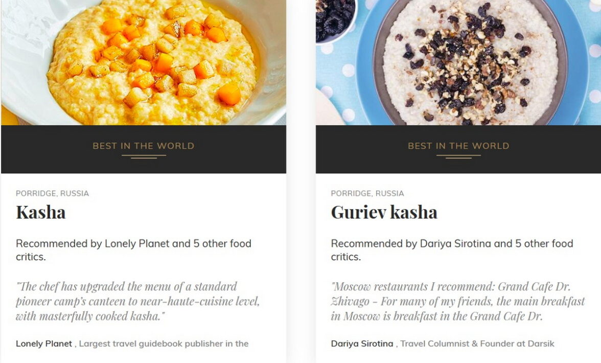 Оценку 4,6 балла имеют «Кафе Пушкинъ» на Тверском бульваре (легендарный бефстроганов, blini, pirozhki); «Гранд Кафе Dr. Живаго» на Моховой, рядом с «Белугой» (легендарная kasha, гурьевская каша, салат «Оливье»), «Чемодан» на Гоголевском бульваре (строганина), Savva в Театральном проезде (пельмени, медовик), «Булошная» в Лялином переулке (грибной жюльен, блины, «птичье молоко»), Savoy на Рождественке (блины), «Матрешка» на Кутузовском проспекте (салат «Оливье», медовик, кулебяки), Мари Vanna в Спиридоньевском переулке (лучший в мире салат «Оливье», медовик, пирожки) и сеть ресторанов грузинской кухни «Хачапури» (шашлык).