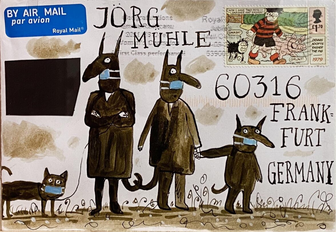 По другим рисункам можно сразу сказать, в какой период отправлялись письма. Так, во время пандемии художник заботливо одел своих персонажей в маски. Впрочем, нельзя не заметить некоторой иронии в этих посланиях.