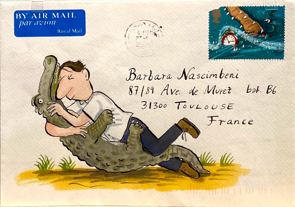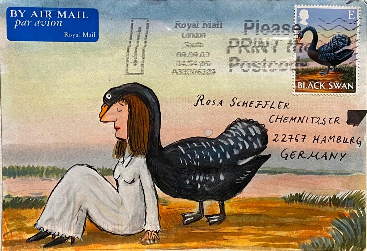Когда Аксель Шеффлер оказался на Британских островах, шел только 1982 год. Электронные письма, эсэмэски, мессенджеры еще не отобрали у почтовых компаний работу, а у людей возможность поупражняться в чистописании. Шеффлер отправлял много писем домой, друзьям, художникам, издателям. И каждый конверт по своему дорабатывал. В таких работах иллюстратор мог позволить себе все, что угодно. Ведь в основном он создавал рисунки для детских книжек. Но сюжеты порой приходят недетские…