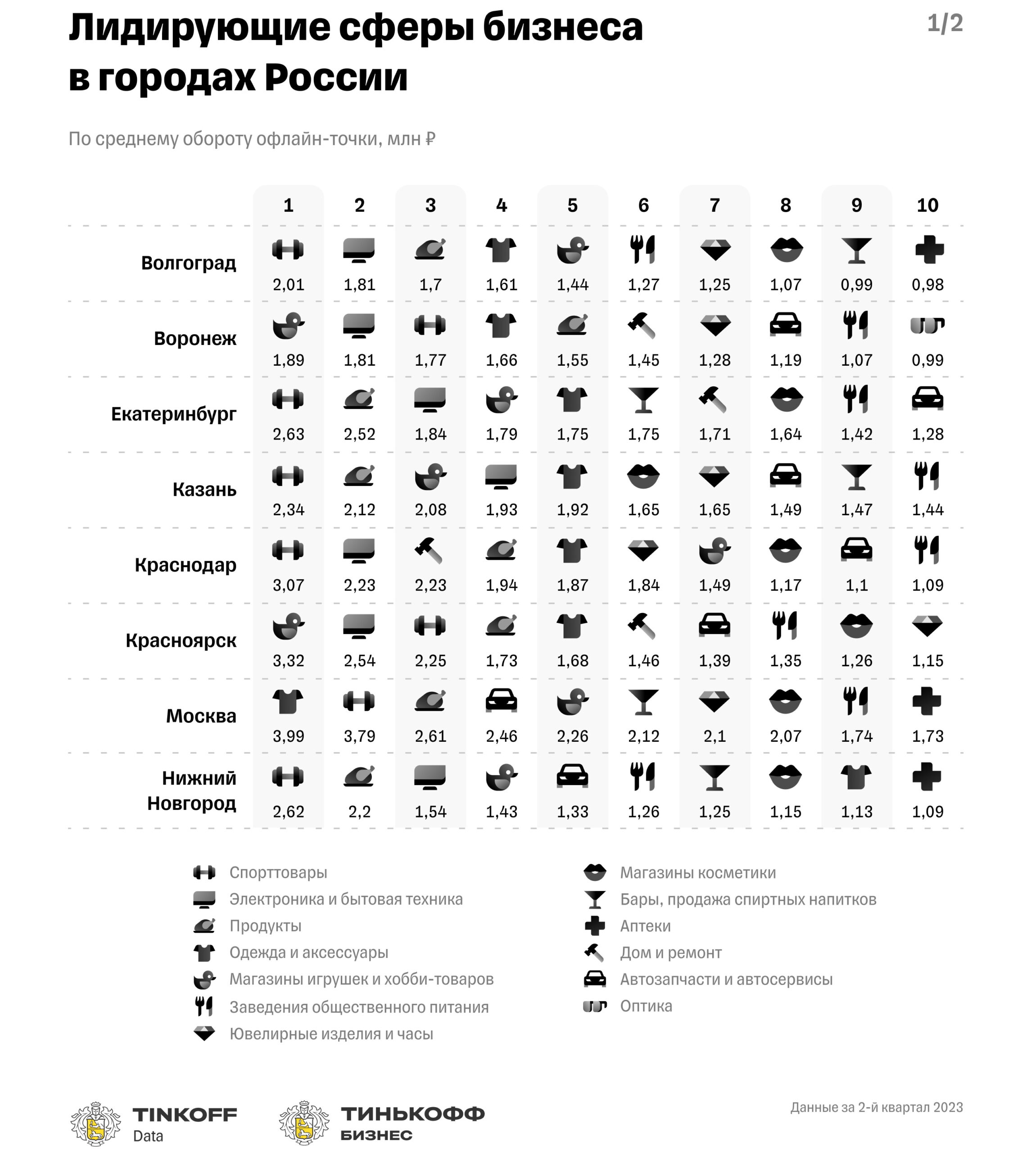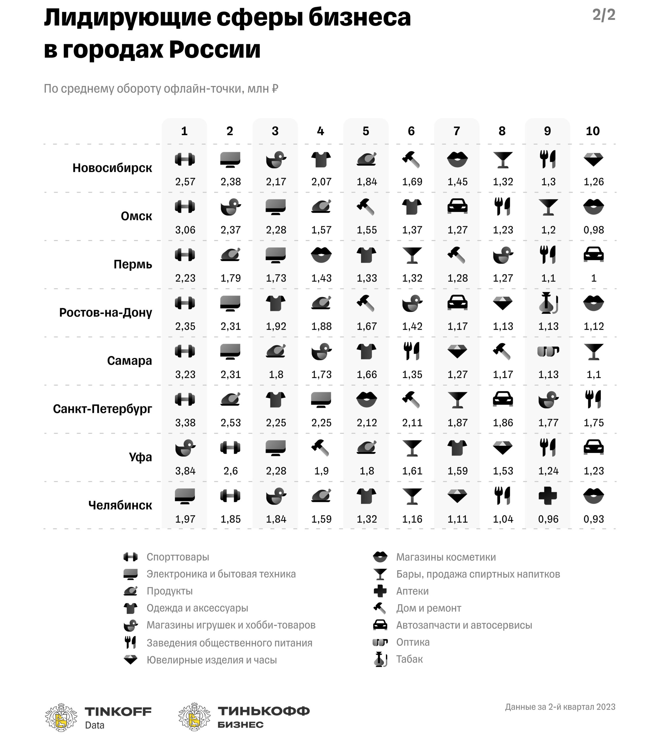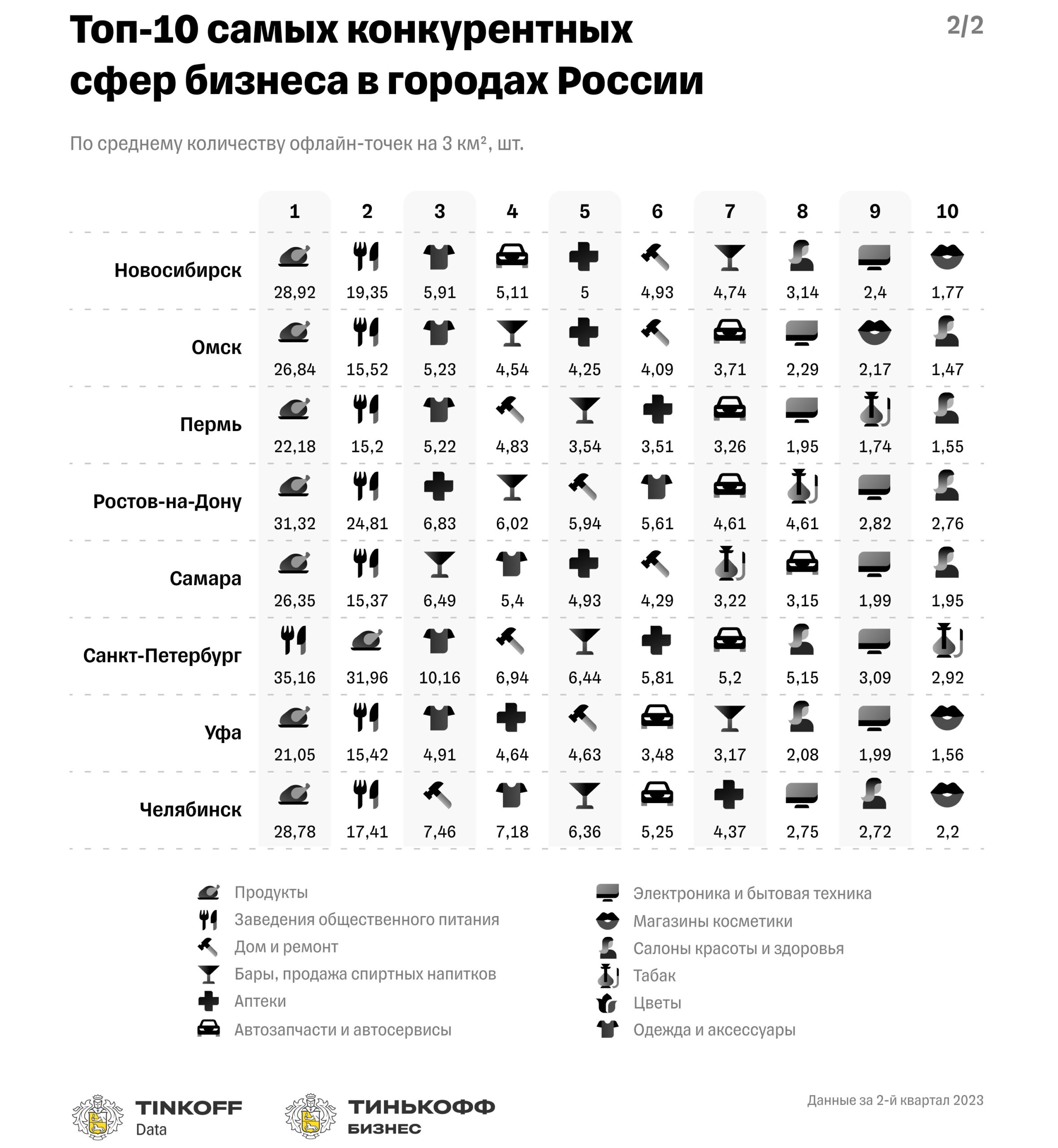 Исследование проводилось платформой финансовых и технологических продуктов для малого, среднего и крупного бизнеса «Тинькофф Бизнес» в рамках аналитического проекта Tinkoff Data. Аналитики собрали и проанализировали данные по 20 самым популярным сферам офлайн-бизнеса из 16 городов-миллионников, на основе покупок 38 млн клиентов экосистемы «Тинькофф».