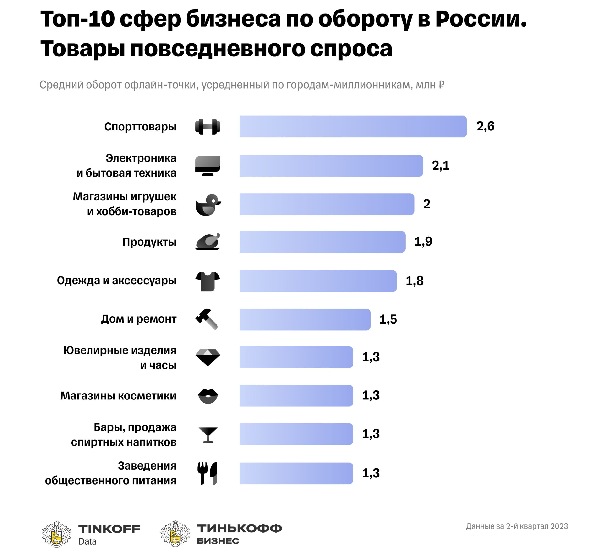 «Тинькофф Бизнес» провел исследование офлайн-ритейла в городах-миллионниках. Лидерами по среднемесячному обороту стали магазины спорттоваров, а по среднему чеку – ювелирные. Самая высокая конкуренция среди продуктовых магазинов и общепита в Москве, где в каждом районе есть 33 магазина, где продают еду, и 37 ресторанов или кафе. А если нужно просто посидеть в баре, то лучше всего отправиться в Красноярск, где в каждом районе найдется семь небольших питейных заведений.