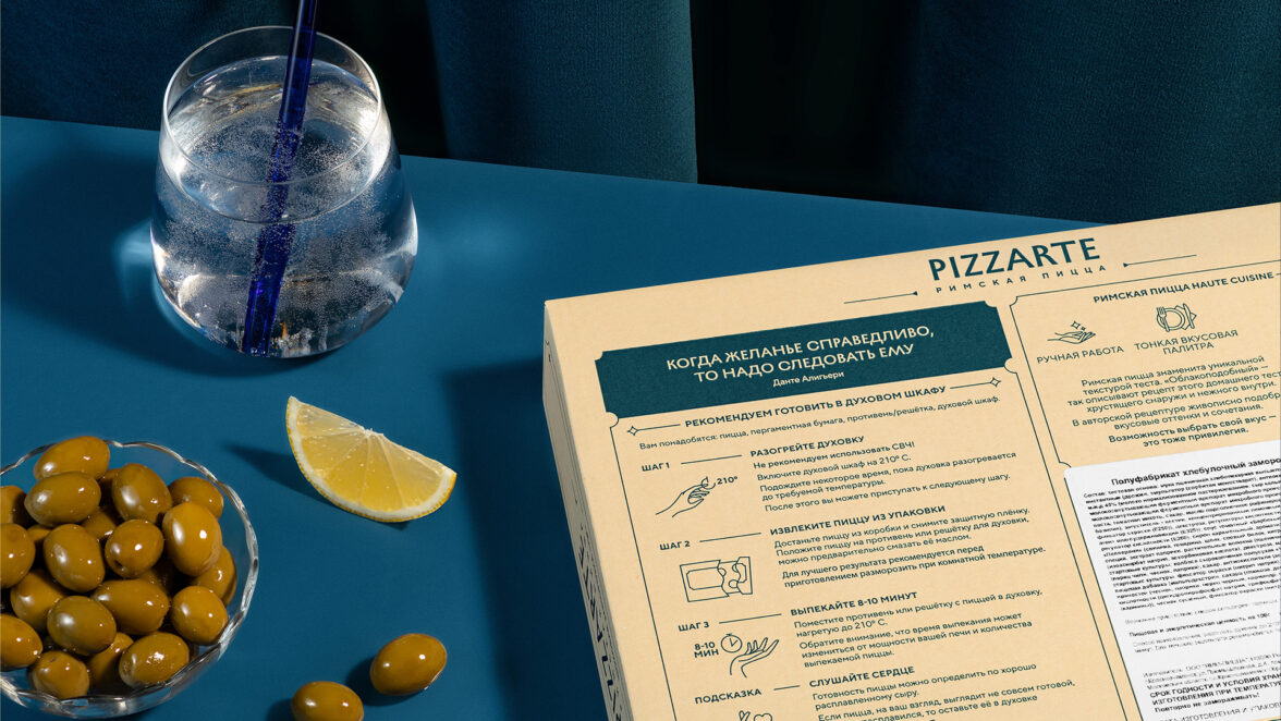 При разработке упаковки учитывались технические ограничения категории: отсутствие прозрачного окна и неаппетитный вид замороженного продукта. Вместо фотографии пиццы мы разместили на коробке гравюру. Это позволило передать гастрономическую тематику через ассоциацию с искусством, избегая удешевления образа.