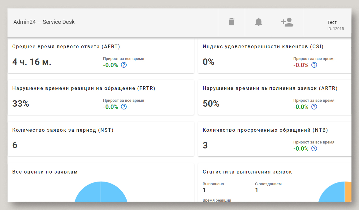 Во многих сервис-десках есть раздел с аналитикой. Она показывает, насколько эффективно работает служба поддержки: быстро ли реагирует на обращения и закрывает их, есть ли нарушения по срокам. А также помогает видеть уровень удовлетворенности клиентов. Не забывайте время от времени просматривать показатели.