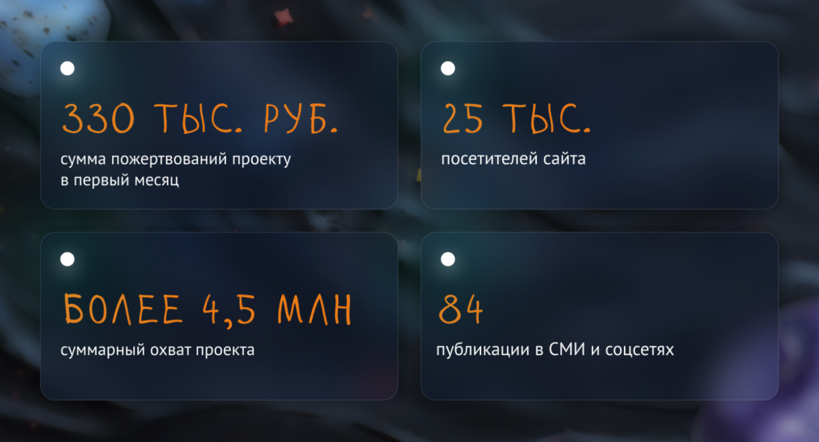За первый месяц проект фонда смог собрать более 330 000 рублей, что стало важным шагом для его дальнейшего развития. Однако самое главное, команда смогла показать людям реальную жизнь неизлечимо больных детей.
