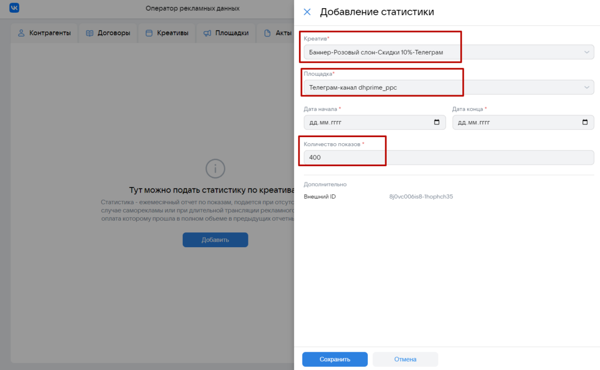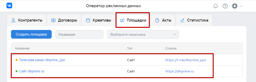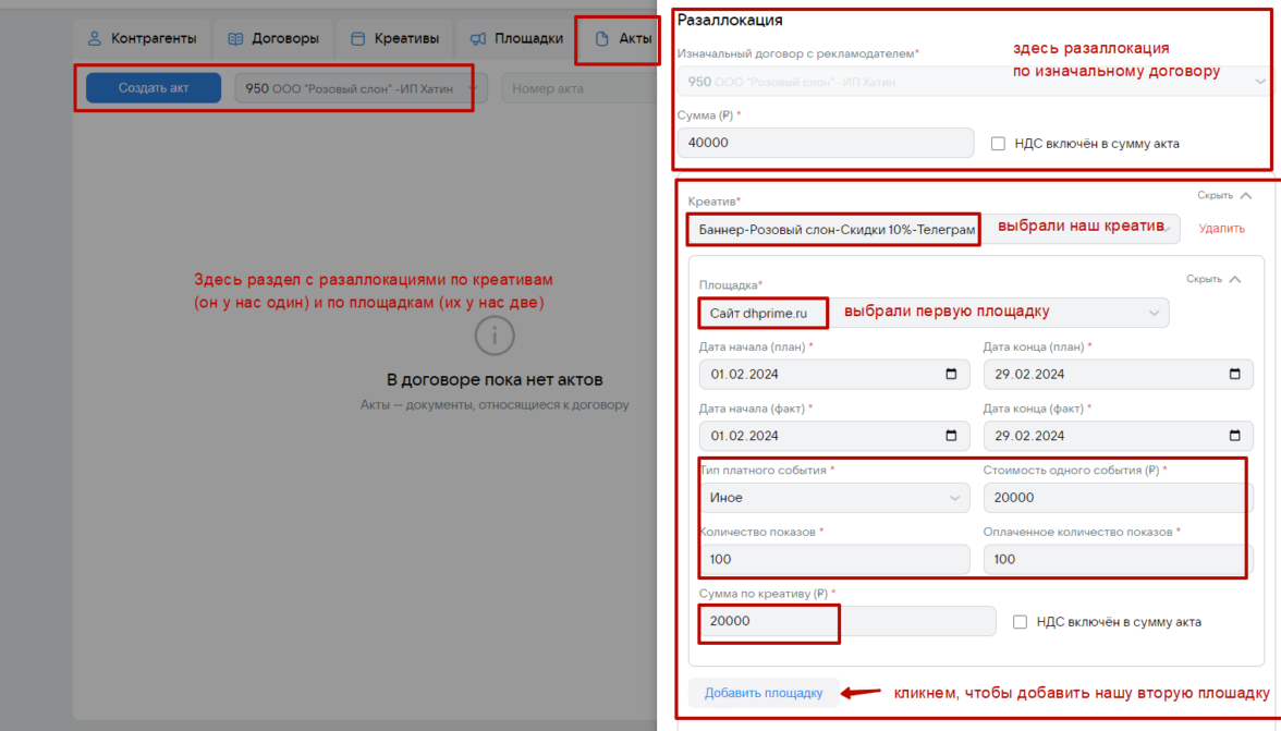 Стоит заметить, что у нас один (единый) креатив будет размещаться на двух площадках. Если бы у нас было два креатива (два токена), но одна площадка, то мы последовательно добавили внутри Акта два креатива с указанием для каждого одной и той же площадки размещения.
