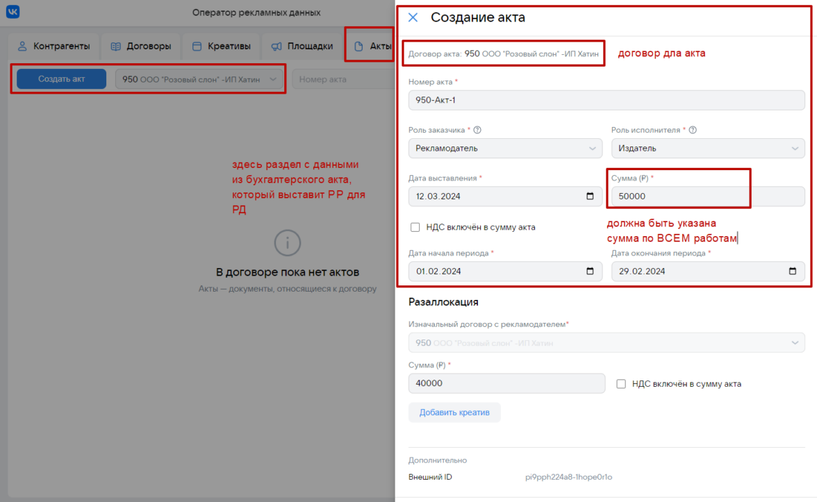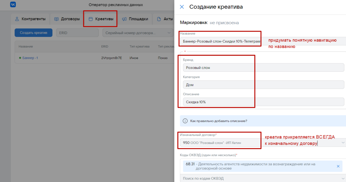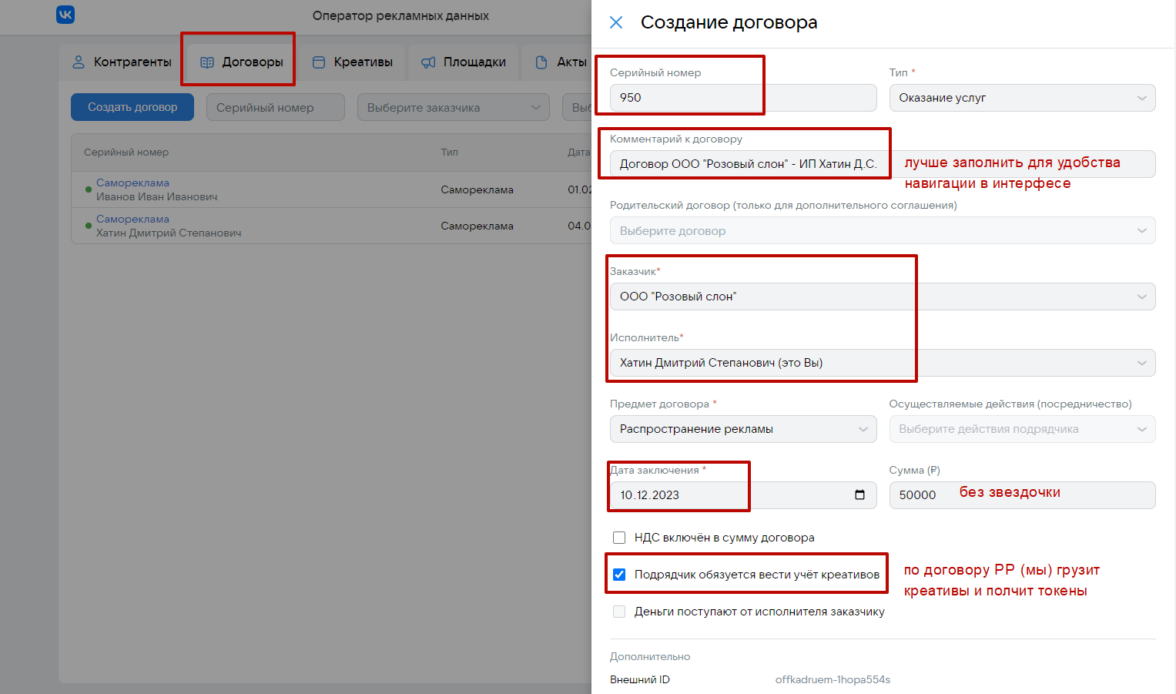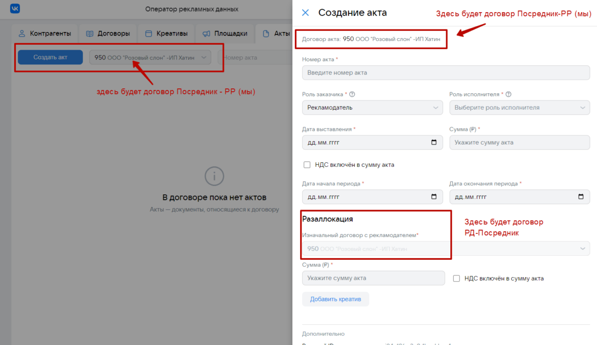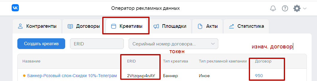 В нашем случае, при короткой рекламной цепочке по нашему Первому сценарию, Изначальный договор и договор РД-РР это одно и то же, поэтому в блоке Креативы указан наш договор № 950 от 10 декабря 2023 года.