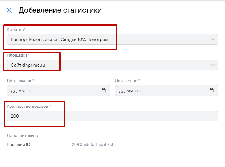 Пример заполнения в блоке Статистика вечной отчетности для площадки dhprime.
