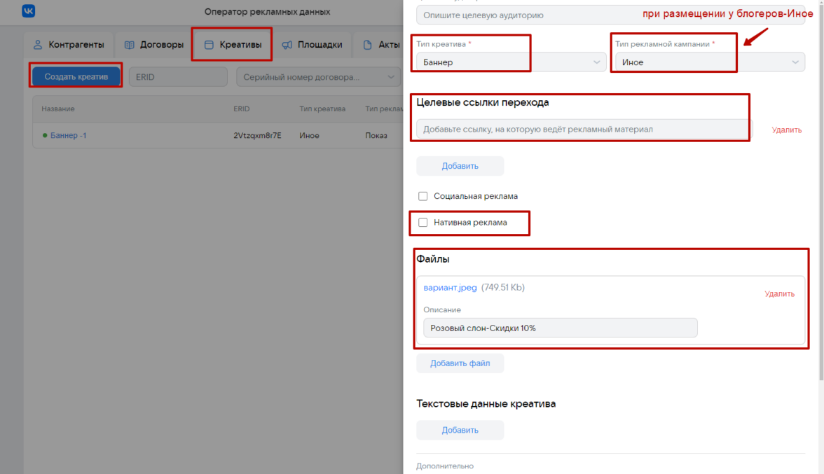 Прикрепление креативов в блоке Креативы всегда производится к Изначальному договору (договор между Рекламодателем и его первым контрагентом).