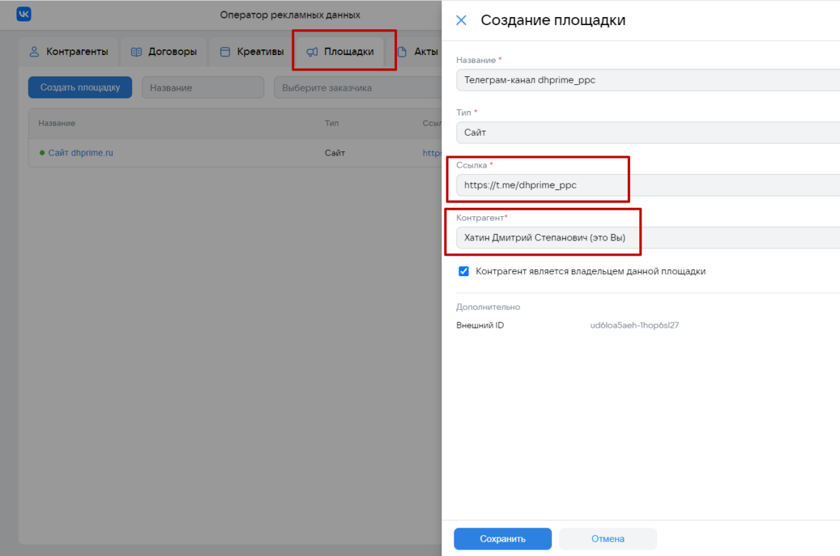 Стоит обратить внимание на чек-бокс с галочкой Контрагент является владельцем данной площадки.