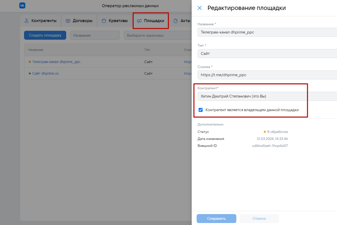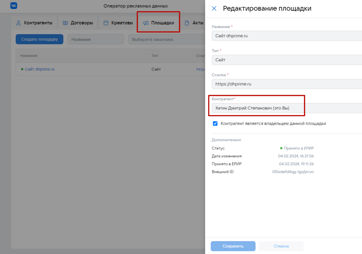 Это говорит о том, что площадка оформлена именно на указанного контрагента в карточке — в данном случае Хатин Дмитрий Степанович в статусе индивидуального предпринимателя.