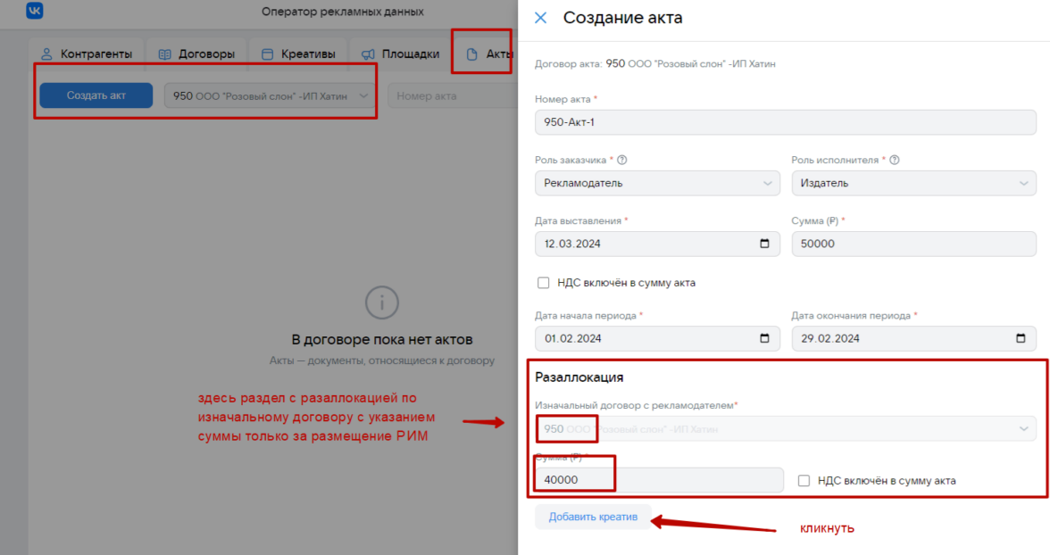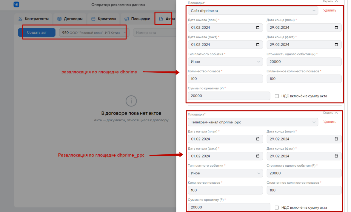 В итоге разаллокация (детализация) внутри Акта по креативам и площадкам произведена, а также произведена внутри Акта разаллокация по изначальному договору.