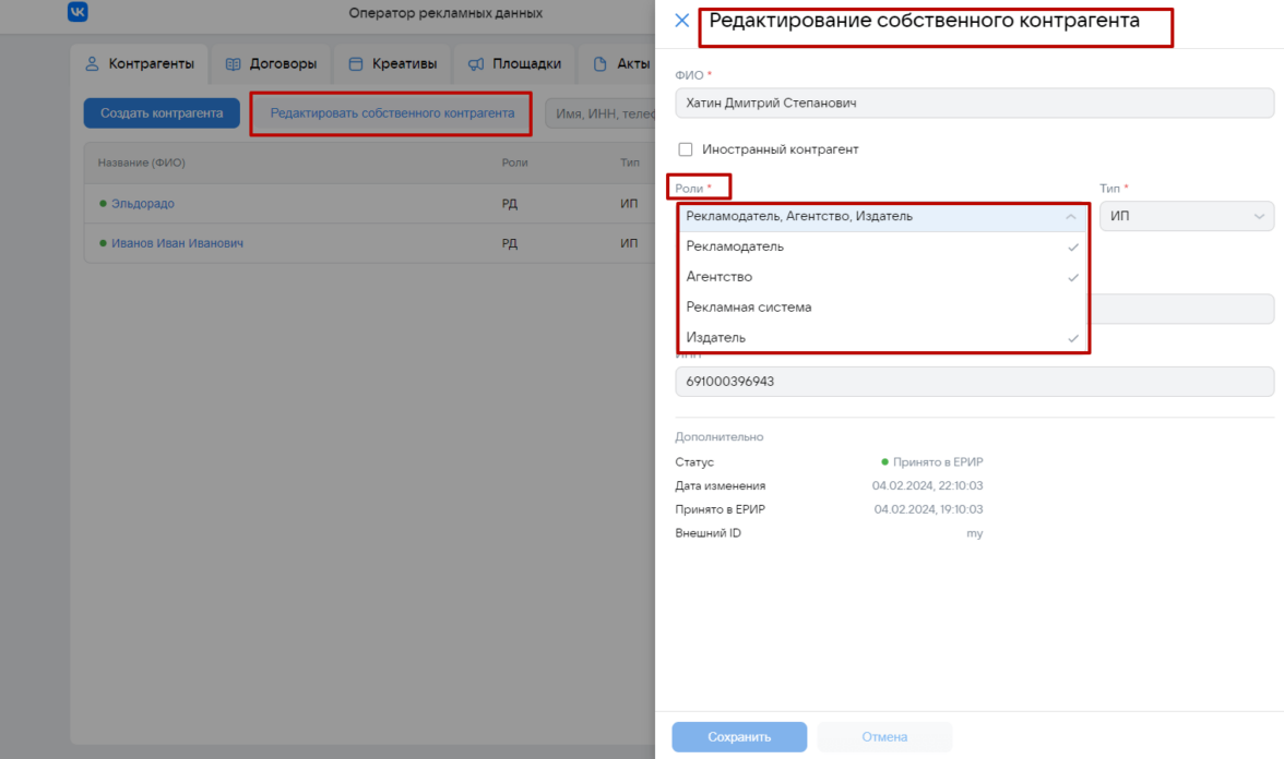Свою карточку (как впрочем карточку любого контрагента, которого вы заведете на платформе) можно будет потом редактировать, расширяя либо урезая роли, которые он может пользоваться в различных рекламных цепочках.