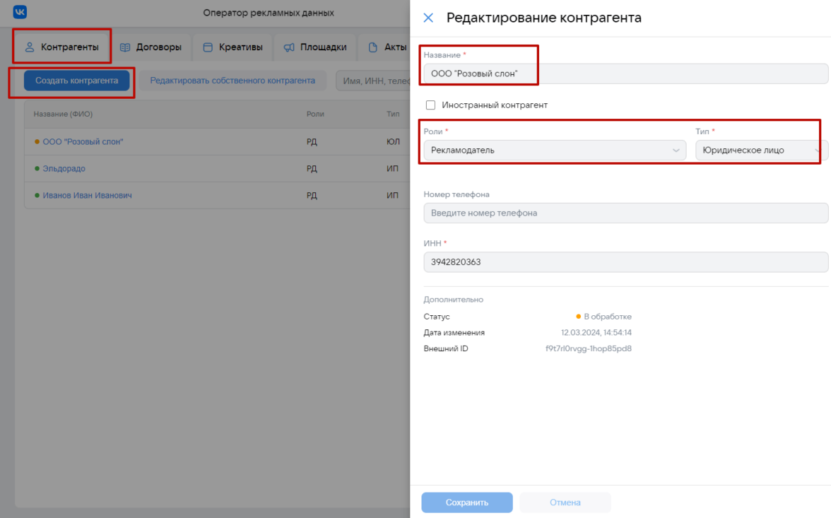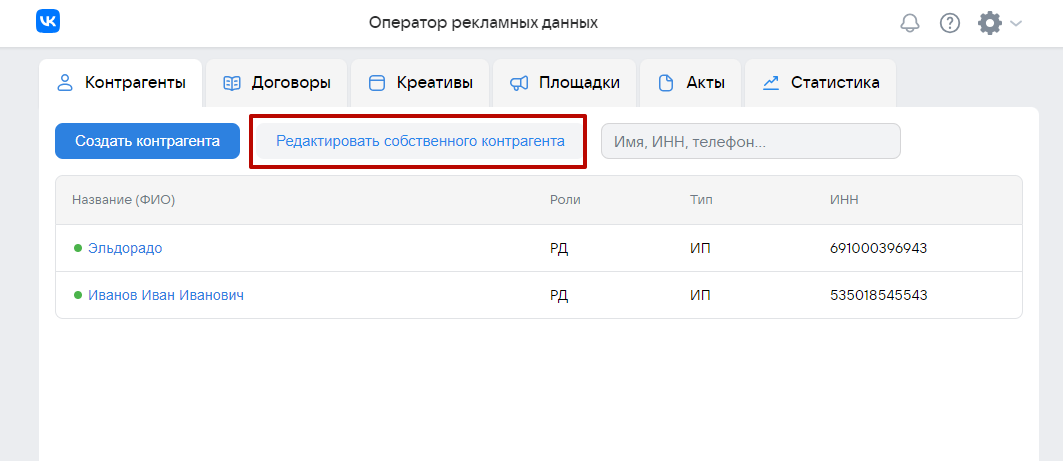 При получении доступа в аккаунт ОРД ВК в блоке Контрагенты пользователь (владелец аккаунта) уже будет фигурировать со своей информацией, которая подтянулась из VK ID.
