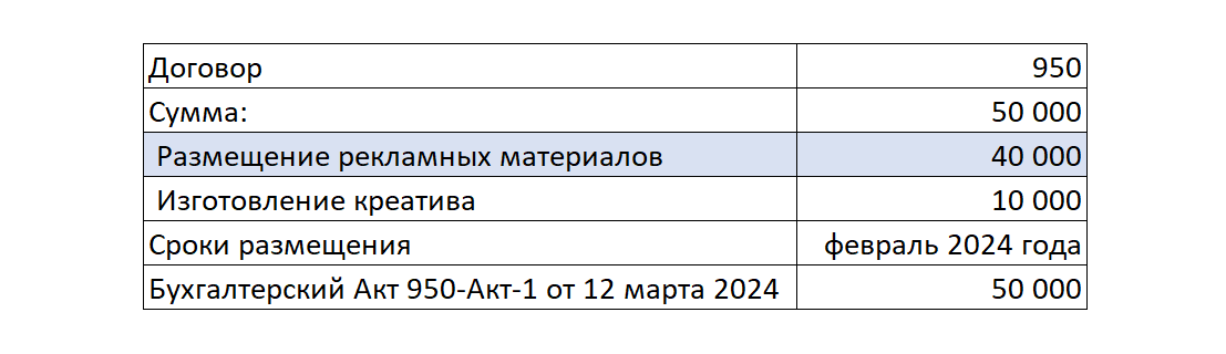 Предположим, что между Рекламодатель и Рекламораспространитель есть договор 950 от 10 декабря 2023 года на размещение рекламных материалов в феврале 2024 года на сумму 40 000 рублей и дополнительным работам по договору (изготовление креатива) на 10 000 рублей. Рекламодатель оплатит услуги по размещению и Рекламораспространитель (блогер) выставит для Рекламодателя бухгалтерский (бумажный акт) 950-Акт-1 в марте 2024 года на общую сумму работ по договору в размере 50 000 рублей.