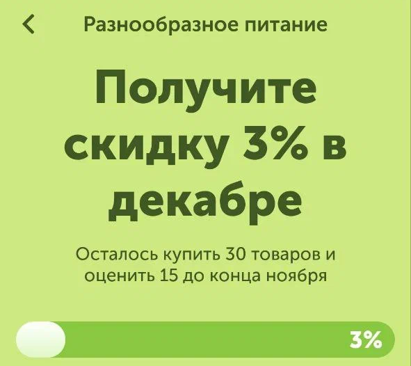 Яркий пример — баллы за отзывы на маркетплейсе Ozon. Еще один — акция от «ВкусВилл»: продавец предлагает купить 30 товаров до конца месяца, оценить 15 покупок в приложении (с развернутым сообщением), а взамен получить скидку 3% на весь следующий месяц. Отличный стимул для клиентов не забывать оставлять оценки.