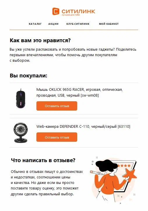 Здесь пригодится собранная база электронных адресов. Например, «Ситилинк» после получения заказа отправляет на почту письмо с просьбой оценить товары и указывает на важность этих действий: «это поможет другим сделать правильный выбор». По этой же схеме работает СМС-рассылка.
