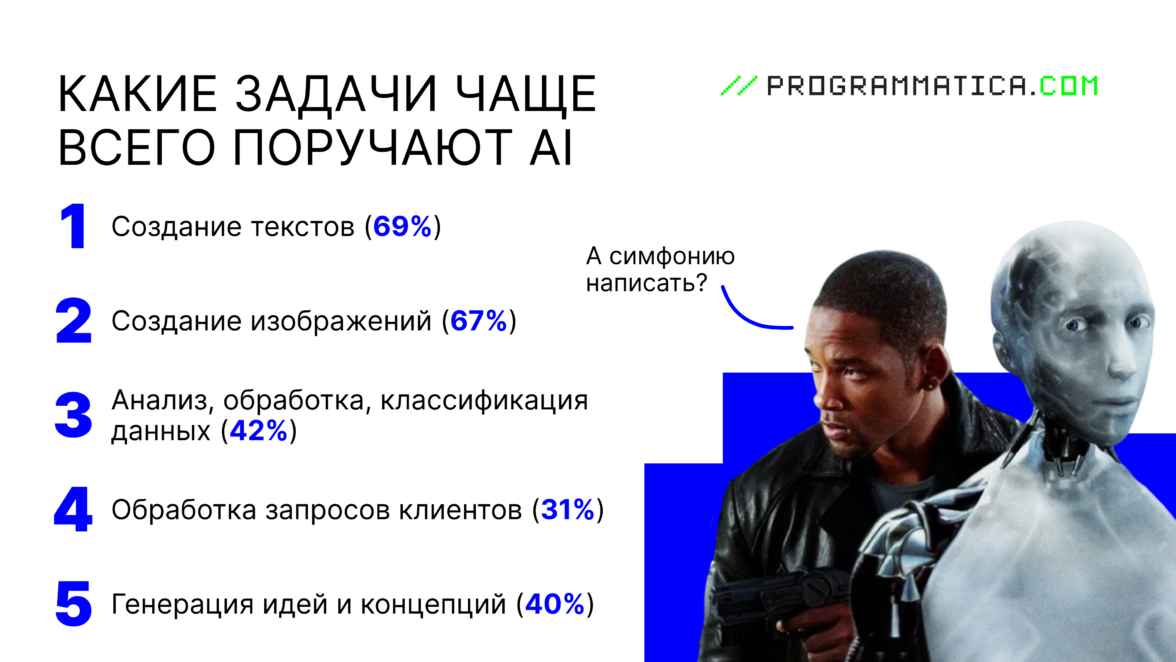 Компании, внедряющие ИИ, не сокращают штат, а перестраивают процессы. Сотрудники, освоившие цифровые инструменты, становятся более продуктивными. Исследование McKinsey показывает, что 60% профессий могут автоматизировать до 30% задач, но это освобождает время для творческой и стратегической работы.