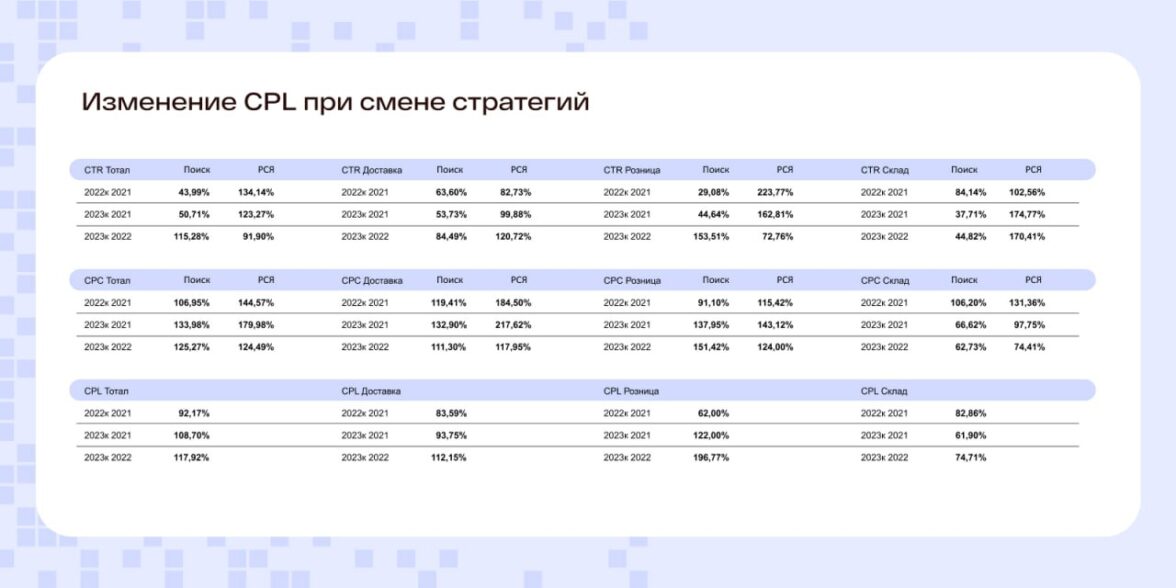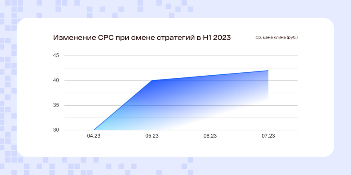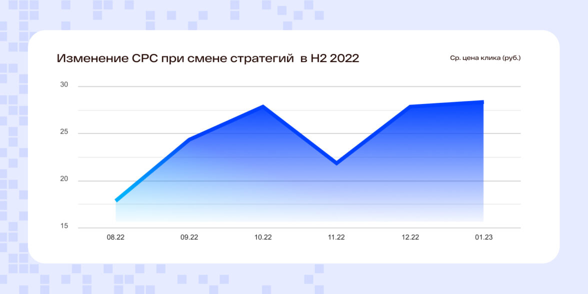 И мы, и коллеги на рынке давно обращали внимание на то, что инфляция бюджетов и цены клика в интернет-рекламе живет своей отдельной жизнью и зачастую оказывается выше общеэкономической инфляции. Для примера, в относительно спокойном 2021 году товары и услуги, по данным Росстата, подорожали на 8,4%, тогда как рост цены клика независимые исследования оценивают в 40%. В 2022-м инфляция усилилась до 12%, а CPC, по тем же данным, прибавила 26%. Наши цифры говорят о том же.