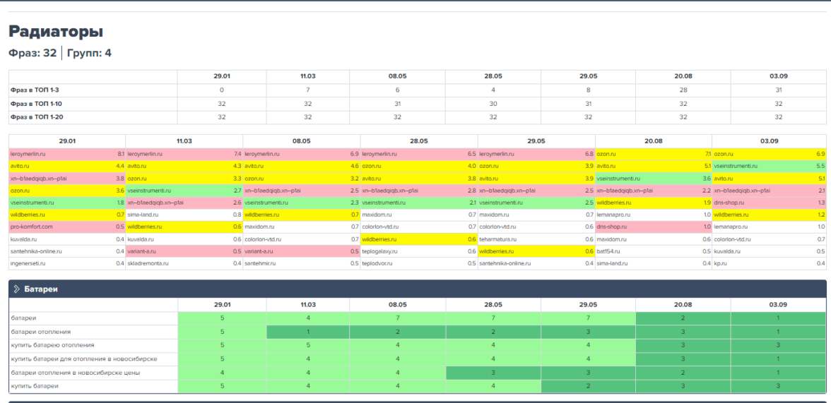 По каждому мониторингу позиции объединены в Топ-3, Топ-10 и Топ-20, которые являются основными показателями эффективности продвижения.