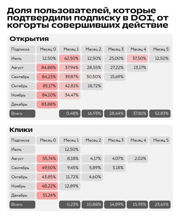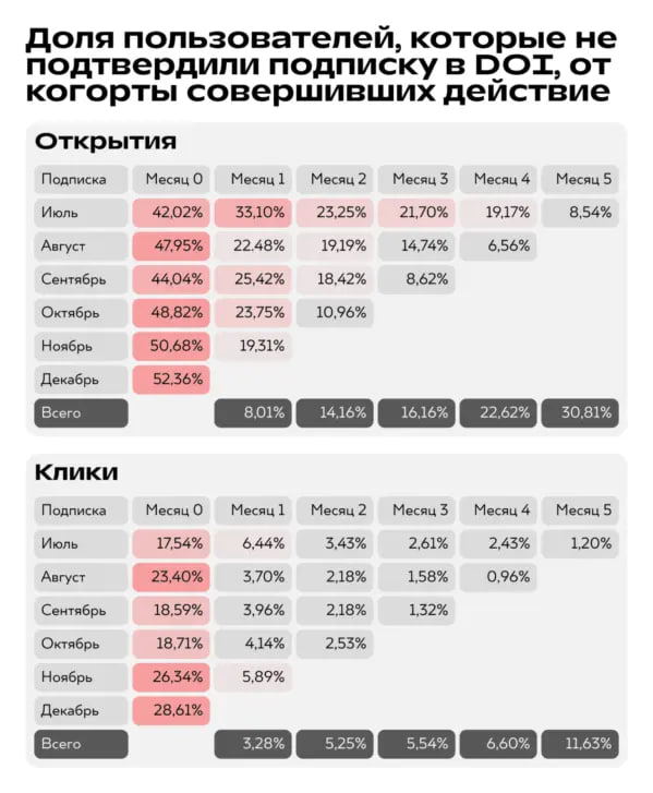Компании продолжают отправлять рассылки без двойного подтверждения подписки и получать выручку. Мы, например, проводили такой эксперимент в проекте: одному сегменту пользователей предлагали DOI, другому — нет. И, независимо от того, подтвердили пользователи подписку или нет, все они в дальнейшем получали коммуникации: триггерные и промо. Провели анализ пользователей по когортам и получили результаты. Безусловно, вовлечённость пользователей сегмента DOI гораздо выше, как и срок жизни. Но открытия и клики в последующих коммуникациях с клиентами, которые подтверждения не дали, также есть, и их не так уж и мало. Вывод такой: DOI отсекает часть пользователей, которые хотели бы получать контент от бренда, но не получат его из-за своей невнимательности или по другим причинам.