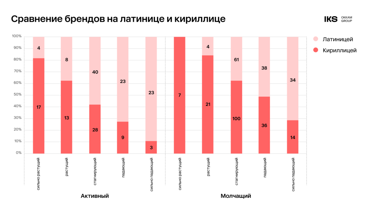 Если вы решили молчать, лучше бы вам называться по-русски. Из молчащих растущих брендов с написанием на латинице — всего 4 случая. При этом два из них — исторически немедийные локальные бренды, а другие два игрока живут в категориях с более чем на 50% сократившейся медиаподдержкой и низким клаттером (рис. 5).