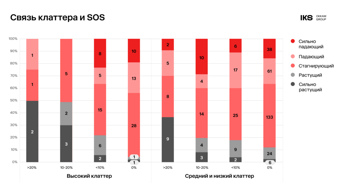 Гонка за доминирование по SoS не оправдана. В категориях с высоким клаттером усиление SOS незначительно увеличивает вероятность успеха по сравнению с аналогичным SOS при низком клаттере (рис. 8).