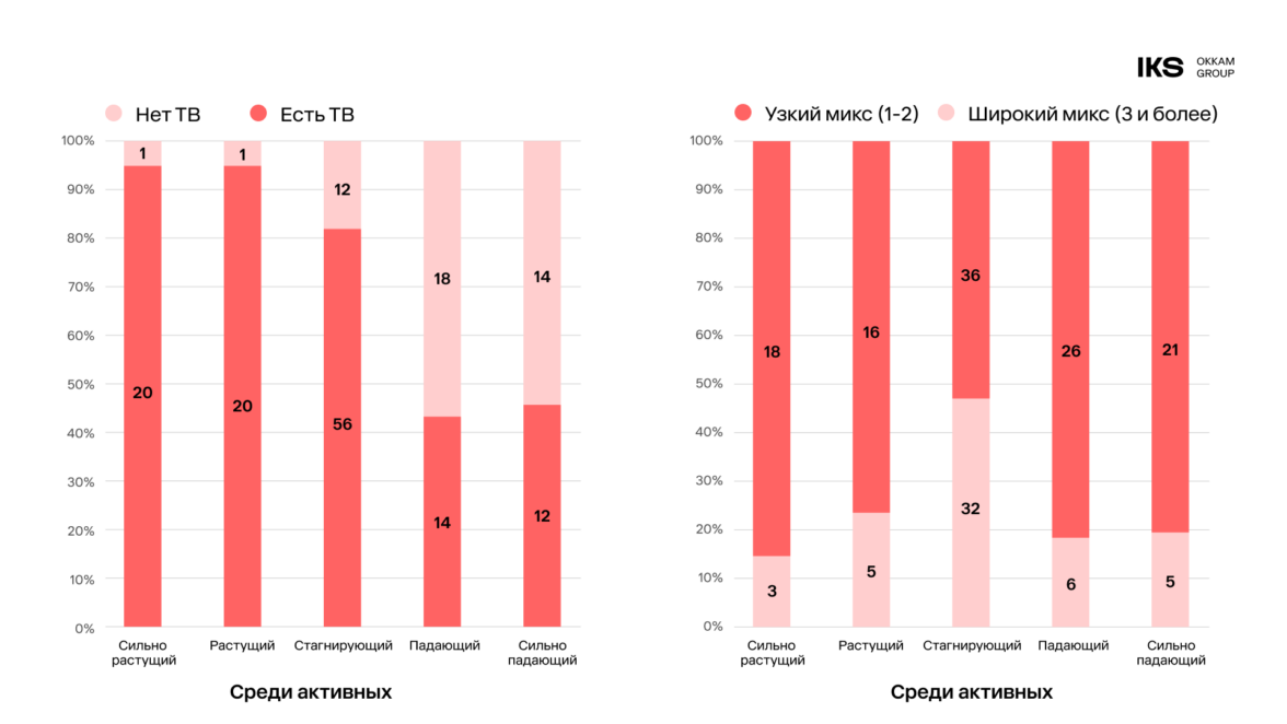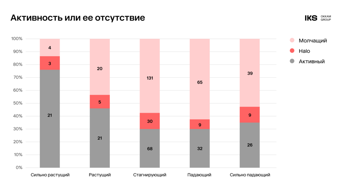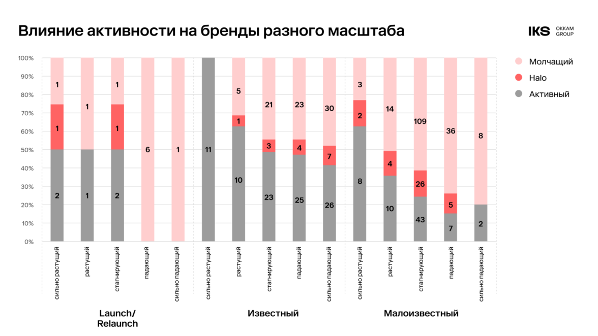 В каждой из групп удалось собрать активные и молчащие бренды, бренды из категорий с высоким и средним клаттером, с высоким или низким проникновением, бренды с разными уровнями знания, запуски. После чего сравнили, как распределились эти факторы внутри разных групп брендов по динамике знания.