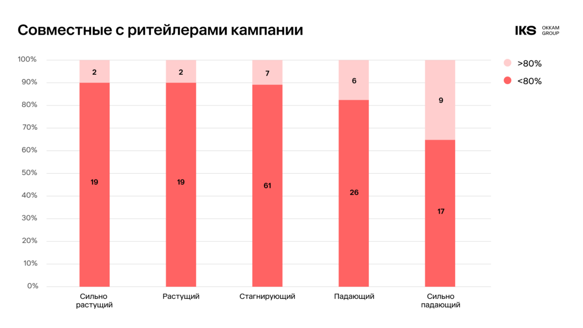 Важна разумная доля копромо. Совместные кампании с ритейлерами — неплохая история, но главное в них — не переусердствовать. У брендов с долей копромо более 80% увеличивалась вероятность негативной тенденции (рис. 10).