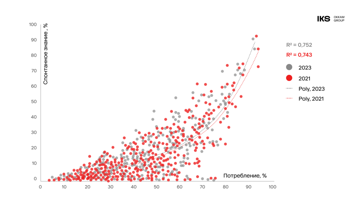 Это наиболее универсальный и эластичный индикатор, который одновременно тесно связан с рекламным продвижением и имеет высокую корреляцию с потреблением. Интересный инсайт по итогу анализа: эта корреляция осталась практически неизменной по сравнению с рынком трехлетней давности — люди по-прежнему склонны потреблять бренды, которые они знают. Гипотеза о вероятной трансформации выбора от головы к полке у растерянного потребителя не подтвердилась (рис. 2).