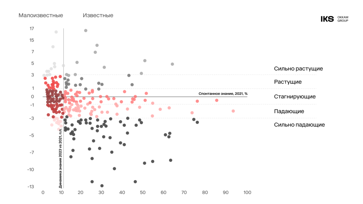 Их чуть больше — 12% от общей выборки. В основном это сильные в прошлом бренды — медийные, международные, с написанием бренда на латинице; они существенно снизили поддержку, за счет чего потеряли позиции.