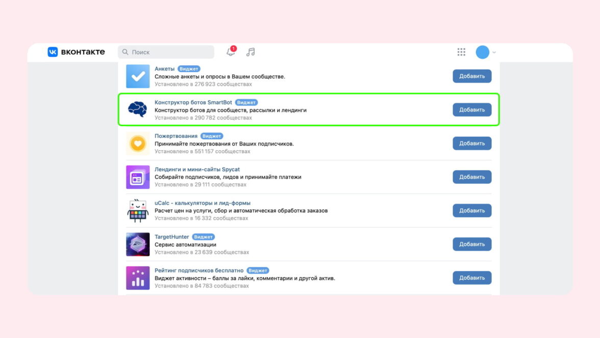 Развиваться конструктору помогал сам ВК: Smartbot занимал первые строки в каталоге приложений, и на органическом трафике его установили более 290 000 сообществ.