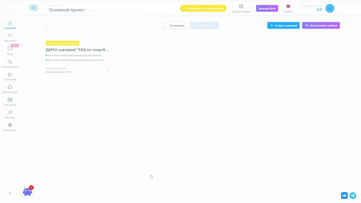 Спустя время мы поняли, что дальнейшего роста продукта можно добиться, только выйдя за рамки ВКонтакте. Идея была в том, чтобы сделать конструктор, в котором пользователю будет достаточно один раз собрать сценарий, и далее этот сценарий сможет работать сразу в нескольких мессенджерах или соцсетях.