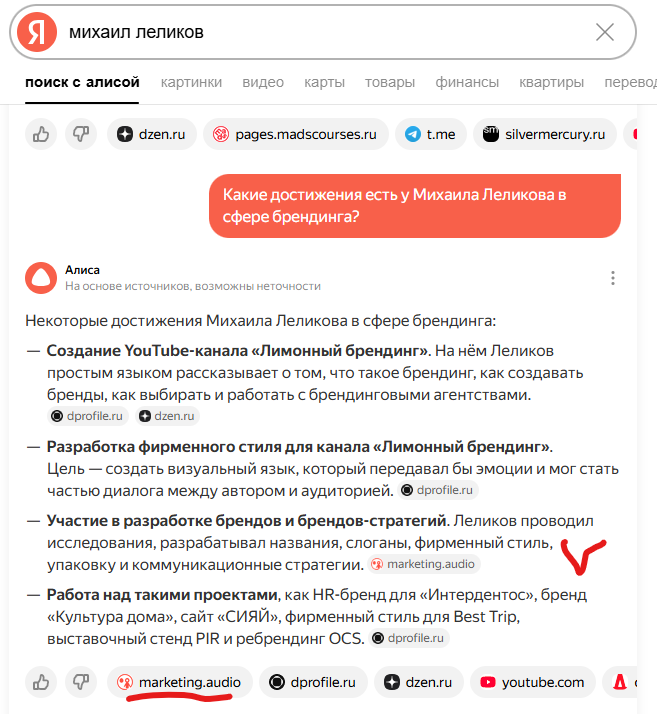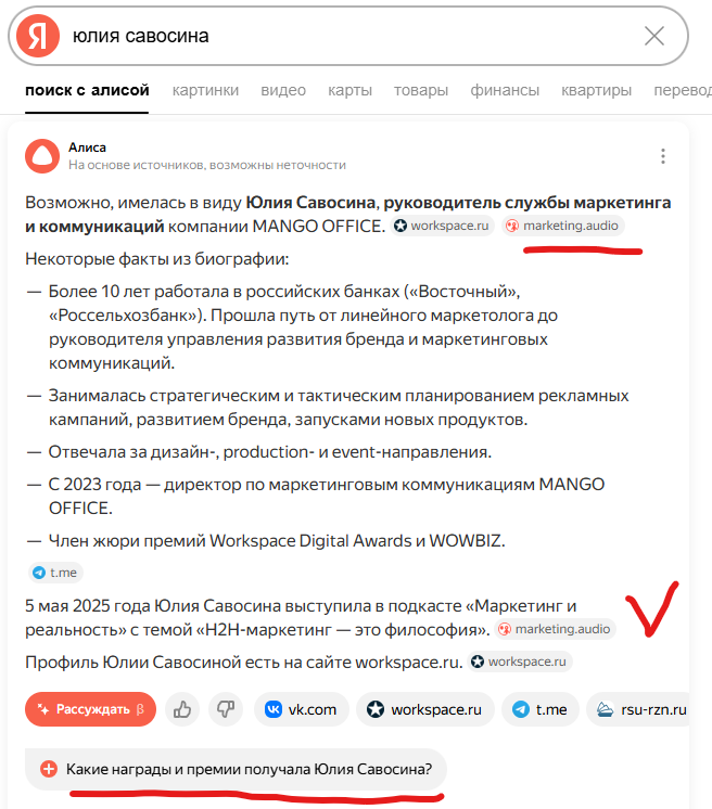 Пример поисковой выдачи от Нейро по эксперту после участия в подкасте «Маркетинг и реальность»