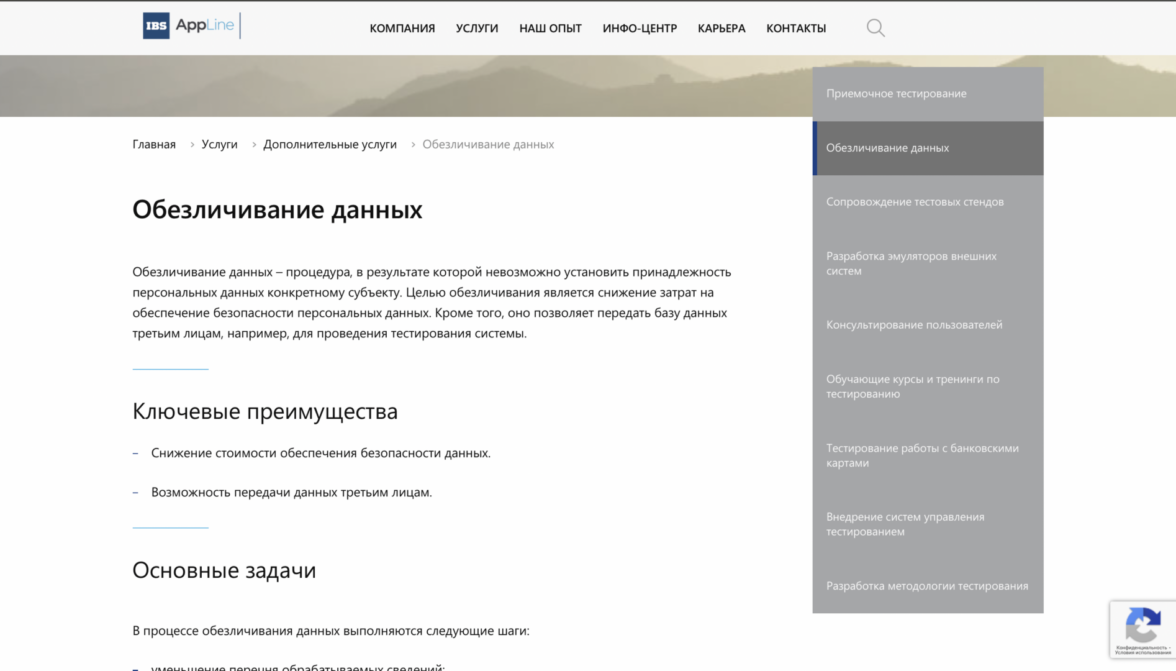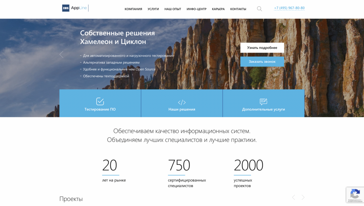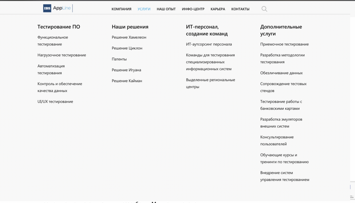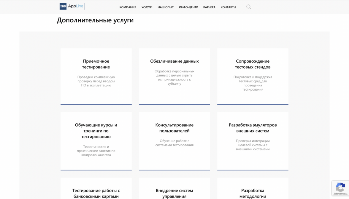 Каждый из трех блоков является началом пути к конверсионному действию. Используя принцип вложенности, мы помогаем пользователю узнавать о продукте все больше и в итоге принимать положительное решение в пользу сотрудничества. Например, услуга «Тестирование ПО» состоит из пяти подуслуг, страница каждой из которых завершается лид-формой.