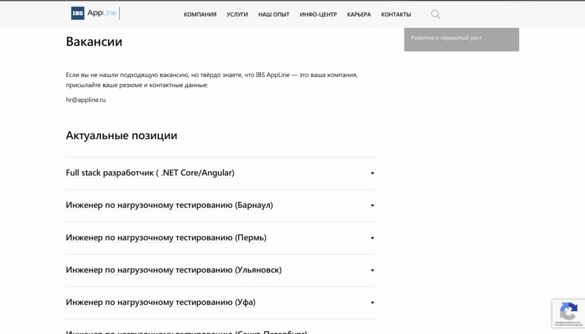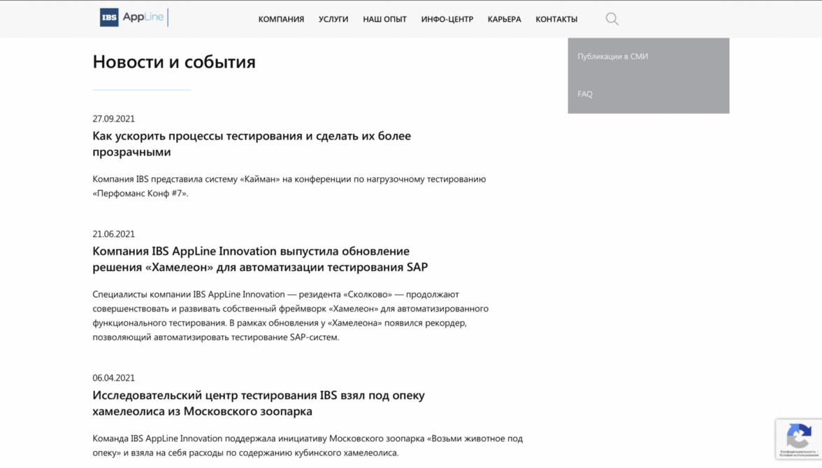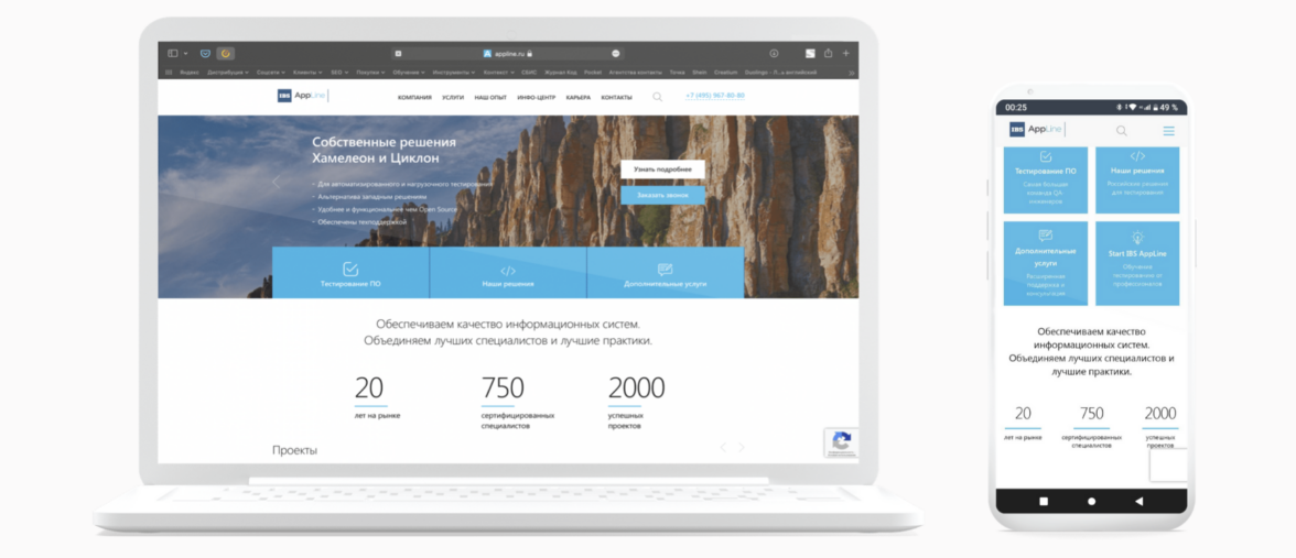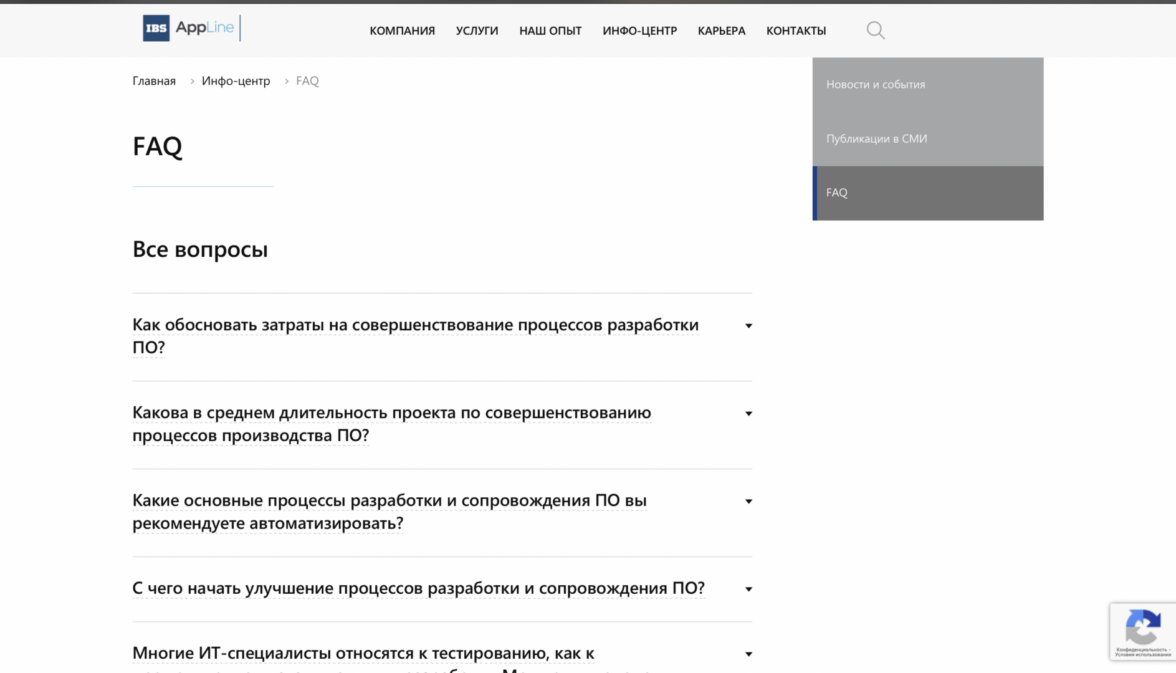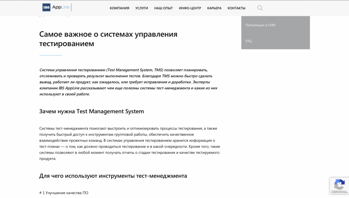 Каждый из трех блоков является началом пути к конверсионному действию. Используя принцип вложенности, мы помогаем пользователю узнавать о продукте все больше и в итоге принимать положительное решение в пользу сотрудничества. Например, услуга «Тестирование ПО» состоит из пяти подуслуг, страница каждой из которых завершается лид-формой.