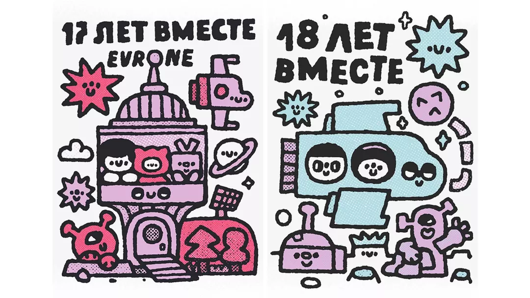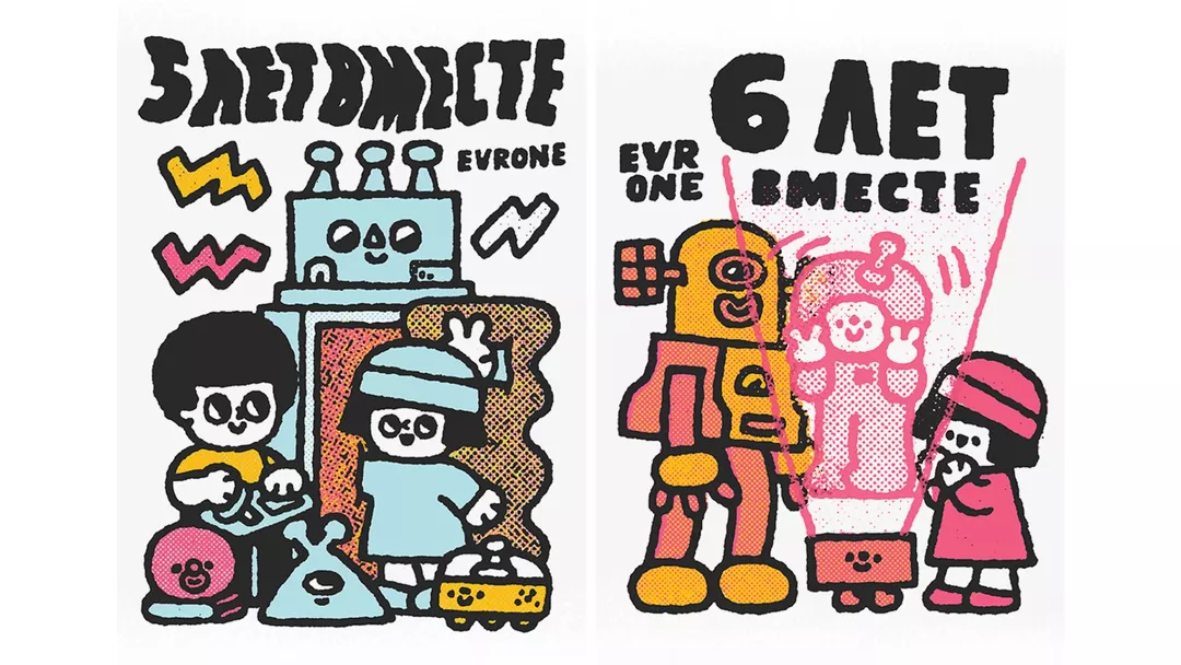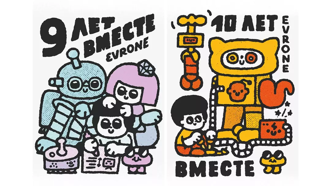 Все открытки для Evrone создаёт иллюстратор Женя Артемьев. Сам он называет свой стиль японским, поскольку он во многом опирается на рисовку японских мультиков о трансформерах и других персонажей, например, Hello Kitty.