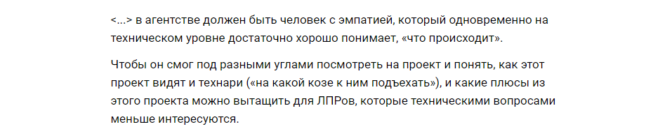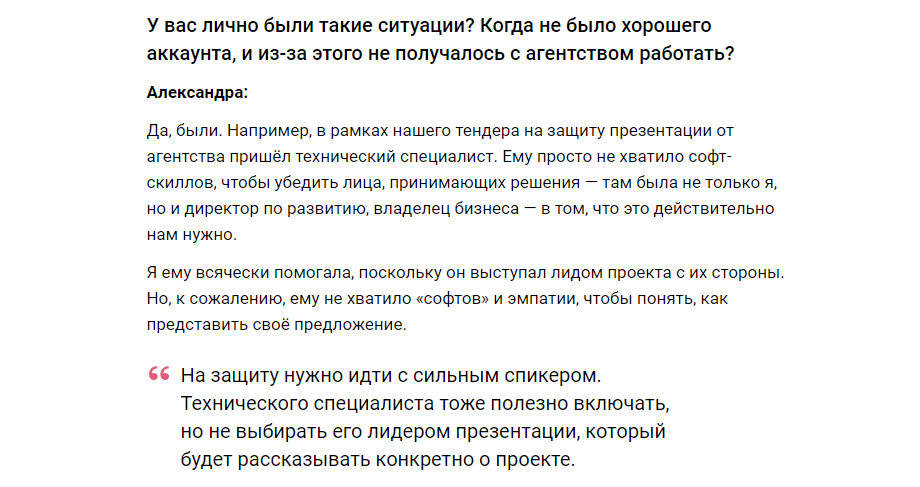 Вот пример из интервью с клиентом, которые проводит Рейтинг Рунета. Специалисту не хватило навыков коммуникации. Я считаю, не стоило изначально от него их требовать, а лучше было позвать аккаунта на встречу.