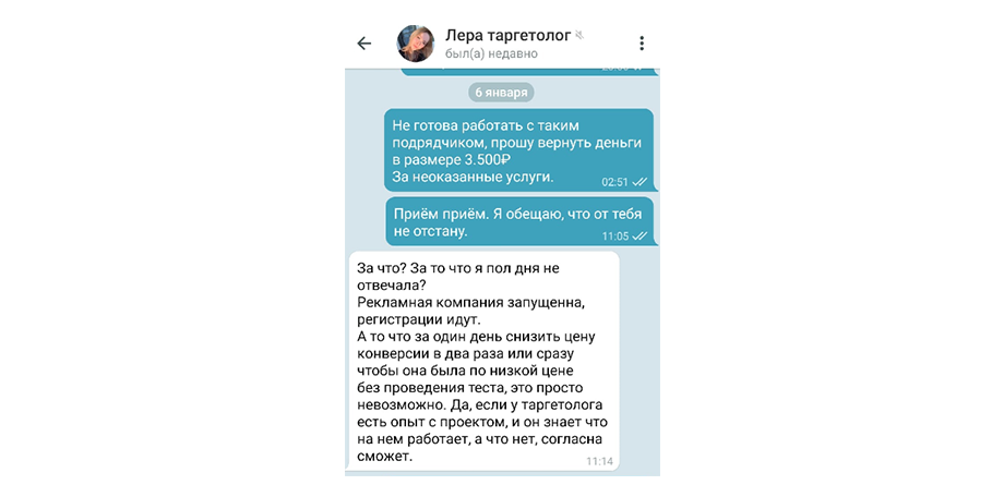 Ниже видим, как таргетолог пытается отстоять свою позицию. Возможно, она права, но у клиента уже создалось неприятное впечатление от ее работы. Все это надо было обговаривать до запуска.