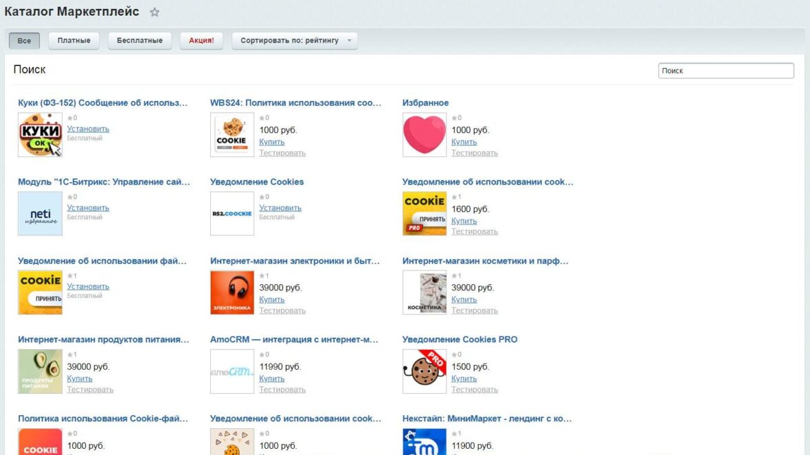 Такие решения доступны в Маркетплейсе «1С-Битрикс» по запросу «cookies»