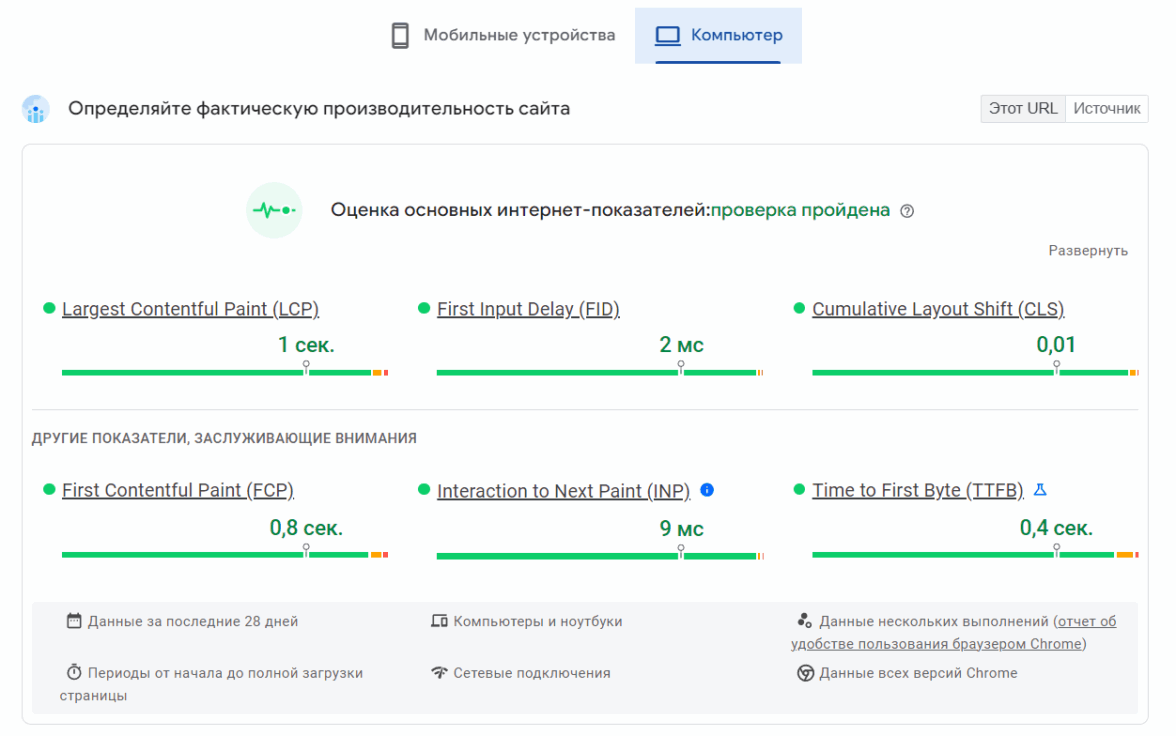 Не забывайте проверять обе вкладки («Мобильные устройства» + «Компьютер»), и пусть ваш сайт так же уверенно будет в зеленой зоне, как на примере ниже.