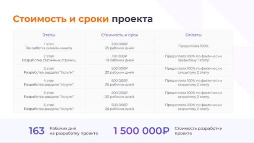 Например, по окончании этапа «Разработка главной и статичных страниц» бизнес получает готовый сайт, с которым можно работать, и уже можно поставить ссылки на социальные сети, запустить рекламный трафик, т.е. делать какие-то активности.