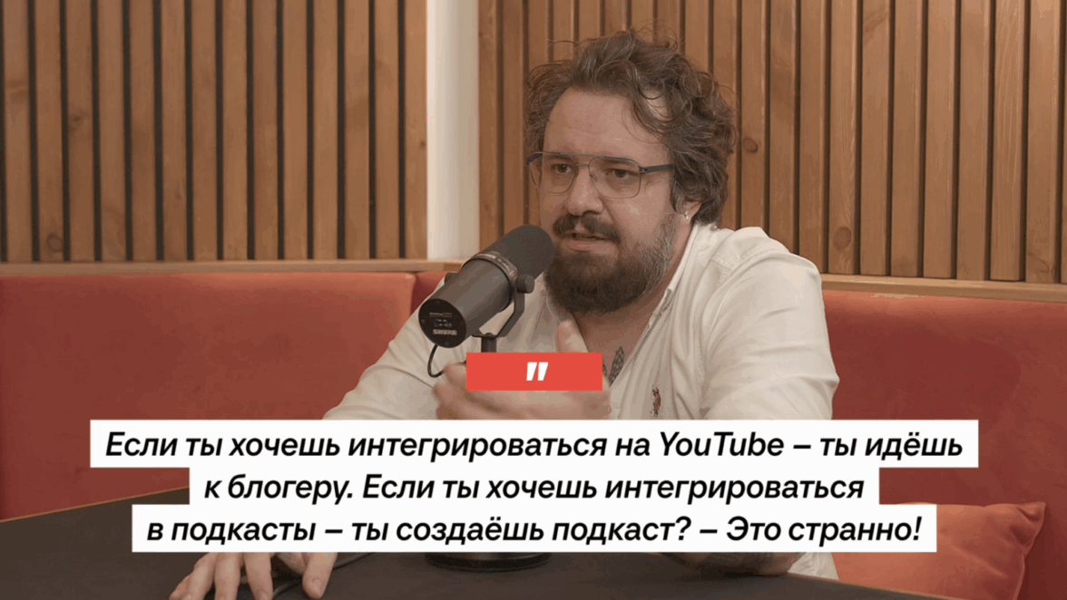 Странно хотеть интегрироваться в подкаст и не идти в существующий, а создавать новый. Сейчас с рынка выбывают те, кто наигрался с бренд-подкастами. Из-за этого рынок тряхануло. Я три года готовился к тому, что бренд-подкасты умрут, и это произошло.